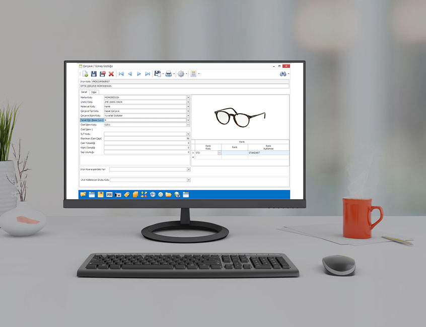 Marka, üretici kodu, materyal kodu, çerçeve tipi, çerçeve biçimi, Base Curv, SUT kodu ve özel işlem kodu gibi çerçeve ve güneş gözlüğüne ait tüm özellikleri ürün kartı içerisinde kolaylıkla tanımlayabilirsiniz.